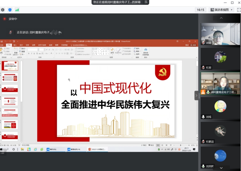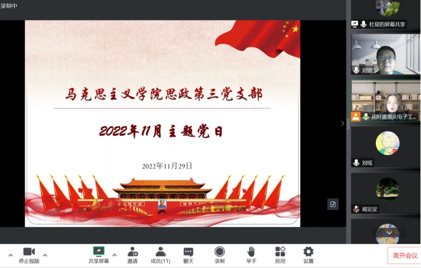 为深入学习宣传贯彻党的二十大精神,切实把教职工的思想和行动统一到党的二十大精神上来,2022年11月29日晚上,beat平台思政三支部在线上开展了“学习新思想,全面贯彻落实党的二十大精神”主题党日活动暨教研室集体备课会,本次活动由周叶露同志主持,支部全体党员参加了活动。