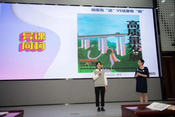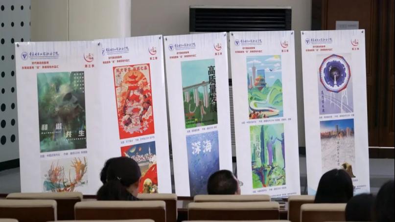 教学中从历史发展的视角“别有洞天”一语双关展示家乡重庆的变化,借助“金课堂”建设成果数字媒体学院员工原创的数十幅主题海报,小切口反映祖国大地现代化的飞速发展和艰难历程。