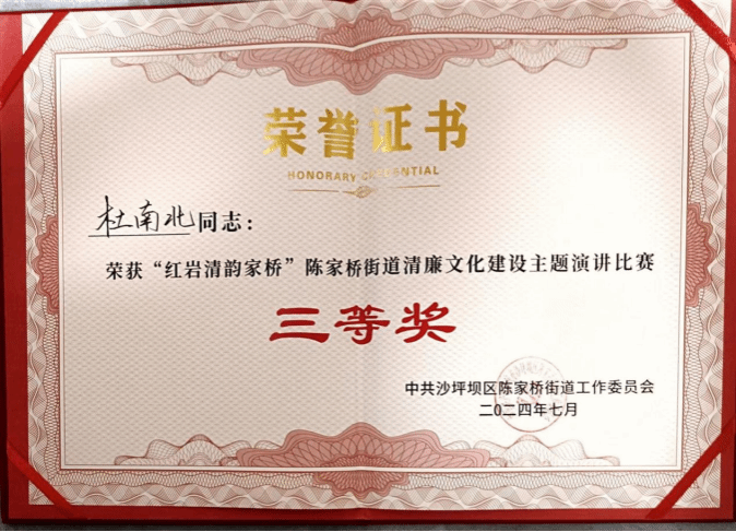 beat平台思政一党支部与学苑社区党委持续开展“红色基因 薪火相传”系列党建联建活动。7月18日,陈家桥街道举行“红岩清韵家桥”清廉文化主题演讲比赛,由思政一支部党员教师李明栩指导的员工作为学苑社区的代表参加该项活动荣获三等奖。