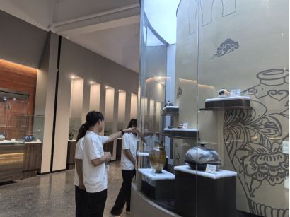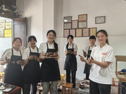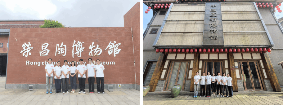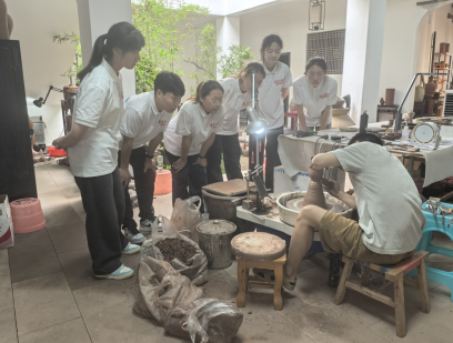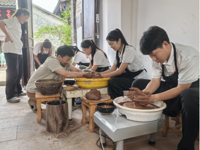 在第二站荣昌安陶小镇,师生参观了荣昌陶博物馆,对荣昌陶的发展历史及文化价值有了深入了解。在陶器制作工坊里,年轻的非物质文化遗产项目“荣昌陶陶刻书法技艺”代表性传承人吕继成老师展示了陶器制作过程,妙手造物展品成型的高超技艺令同学们惊叹。吕老师和同学们做了深入交流,向同学们介绍了自己在传承荣昌陶古老技艺的同时,将书法、篆刻融合其中进行设计创作,不断提升荣昌陶的文化内涵,同时通过微信视频、抖音等直播平台向外界推介荣昌陶,让更多人了解具有民族特色、地域特点的非物质文化遗产。经过吕老师指导,同学们也亲手制作出了自己的陶器作品。