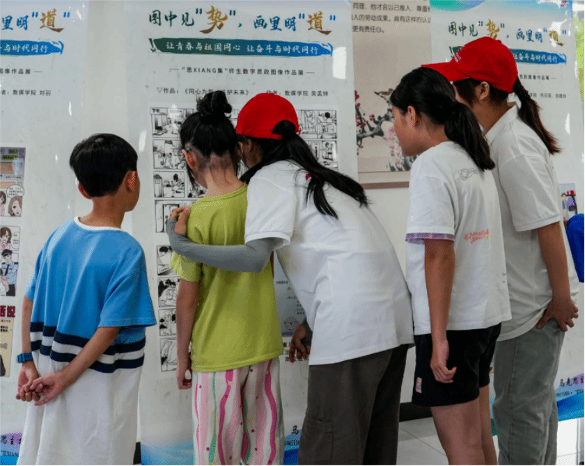 从“诚实守信的重要性”到“校园欺凌的危害”,再到“网络安全的注意事项”,志愿者们解说展览环节一边引导青少年们参观展览,一边耐心讲解数字绘画作品中的法律知识和故事。青少年们或驻足凝视,或低头沉思,或与志愿者们热烈讨论,他们不再是被动的接受者,而是积极的探索者。这种寓教于乐、互动参与的教学方式,不仅让法律变得亲切可感,也激发了青少年们尊法、学法、守法、用法的热情与兴趣。