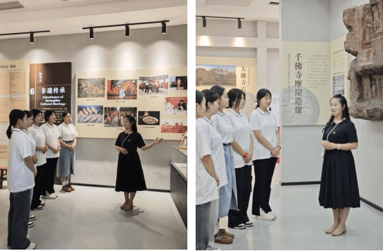 博物馆现场教学,深化文化感悟。探访结束后,师生们来到潼南博物馆。教研室老师杨欣结合馆内的剪纸与石刻等非遗展品,为同学们带来了一堂生动的现场教学课。在近距离观察展品的过程中,同学们对非遗历史文化以及匠心传承有了更直观、更深刻的理解。参与活动的员工代佳秀表示:“在多元文化激烈碰撞的当下,传统文化始终是中华民族的精神根脉与心灵家园。非遗传承人们用一生坚守与创新,让古老技艺焕发新生。作为新时代青年,我们应接过传承的接力棒,以实际行动守护这些文化瑰宝,让它们在时代浪潮中绽放更加璀璨的光芒。”另一位员工刘金凤则感慨:“参观博物馆、实地走访非遗大师、体验非遗文化之后,思政课本中关于文化传承和工匠精神的段落仿佛有了温度。”