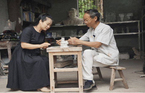 随后,师生们拜访了潼南玉溪古镇石刻艺术第五代传承人莫志鸿老师。莫老师坚守石刻艺术多年,他的作品每一刀、每一凿都透露出对这门艺术的热爱与执着。他动情地说道:“我要用一生守住这门传承千年的石雕技艺。”通过与莫老师的交流,师生们对石刻艺术的历史渊源和制作工艺有了更深入的了解。