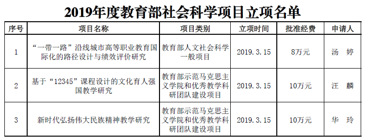 近日,公司在2019年度教育部社会科学项目申报中取得立项3项的好成绩,实现公司近五年国家级科研项目零的突破。同时,公司2019年教育部示范beat平台和优秀教学科研团队建设项目立项数量位列全市高职首位。本次项目信息如下: